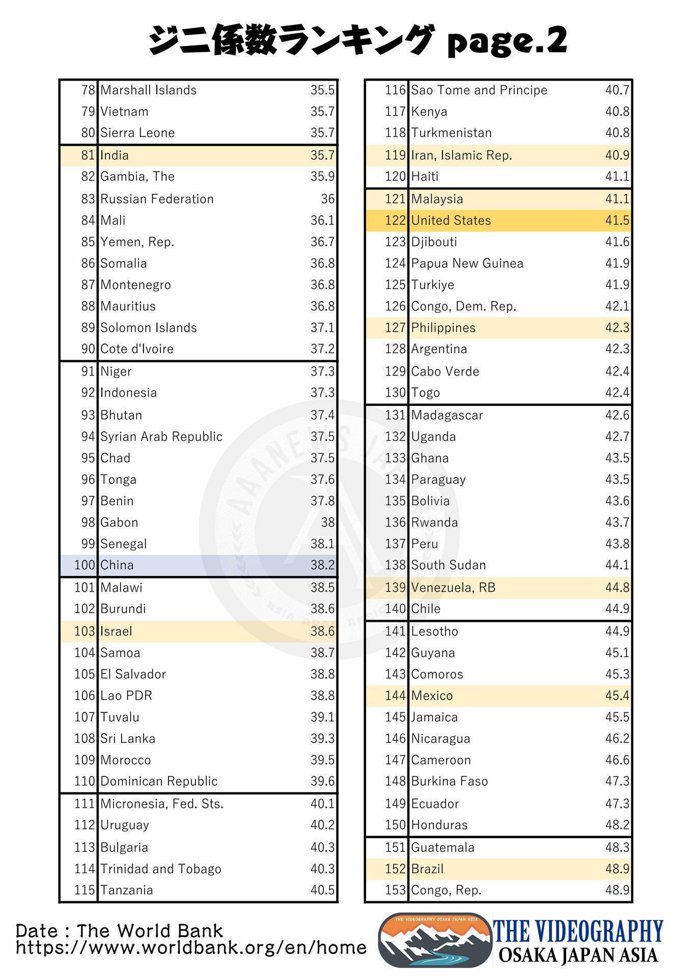 ジニ係数 ランキング Gini Index・日本 51位 先進主要国の中で中位グループ。日本は所得の再分配システムが機能し、経済格差のない国。平等な日本と言える。下位グループにはアフリカ 南米諸国が入っており、貧富の格差が激しい。