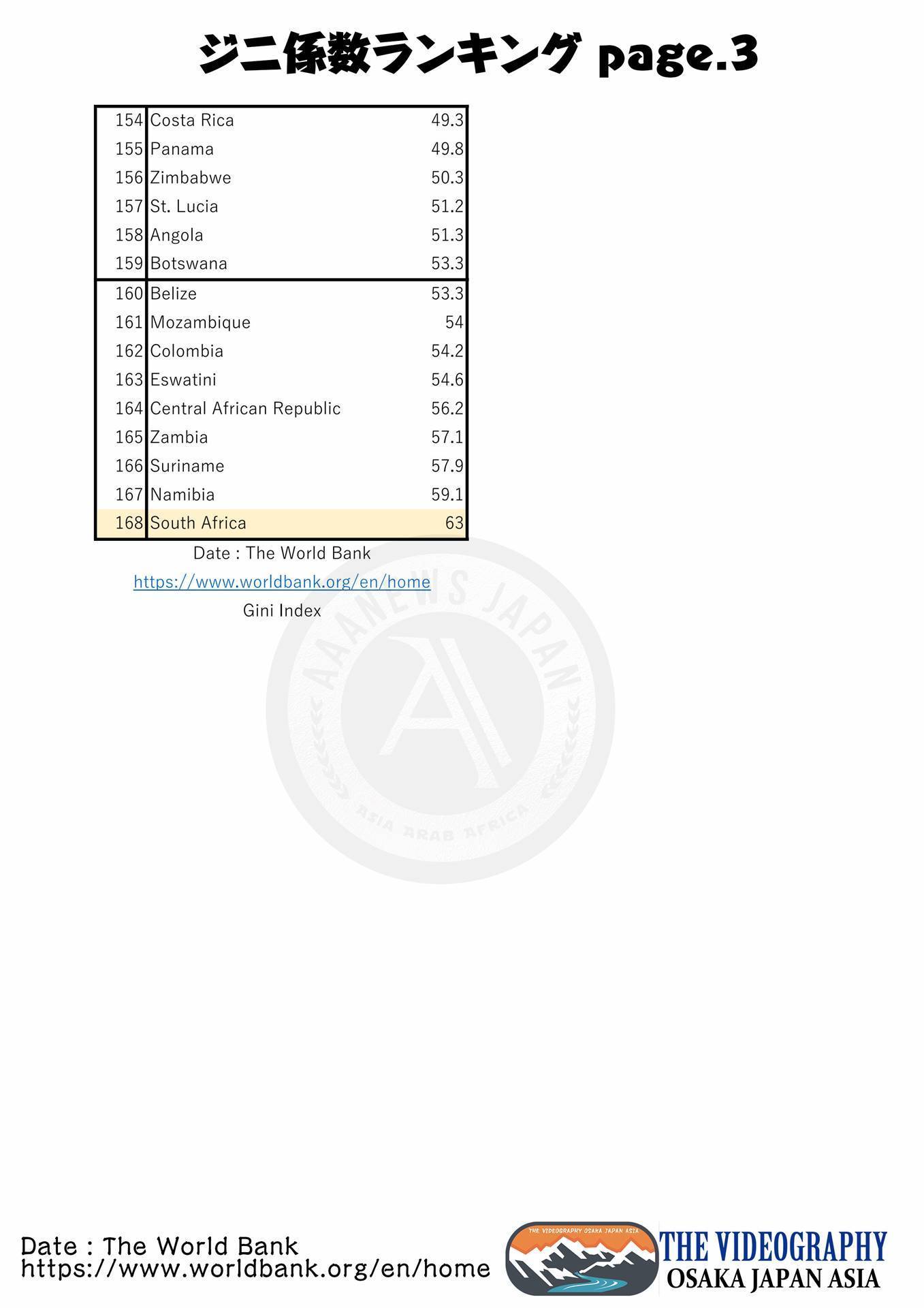 ジニ係数 ランキング Gini coefficient・ランキング下位には、所得の再分配システムが機能不全に陥っており、経済格差 所得格差 貧富の格差がある国 アフリカや南米の国が連なっている。