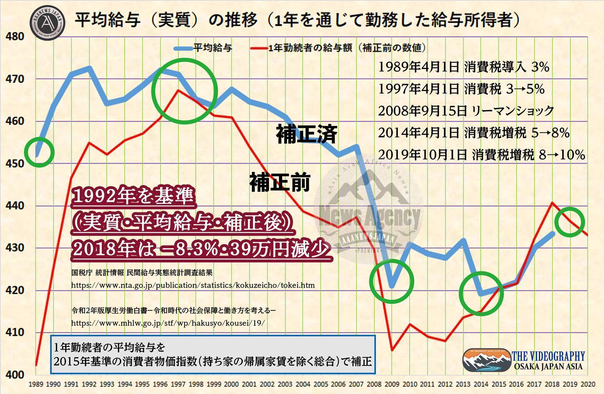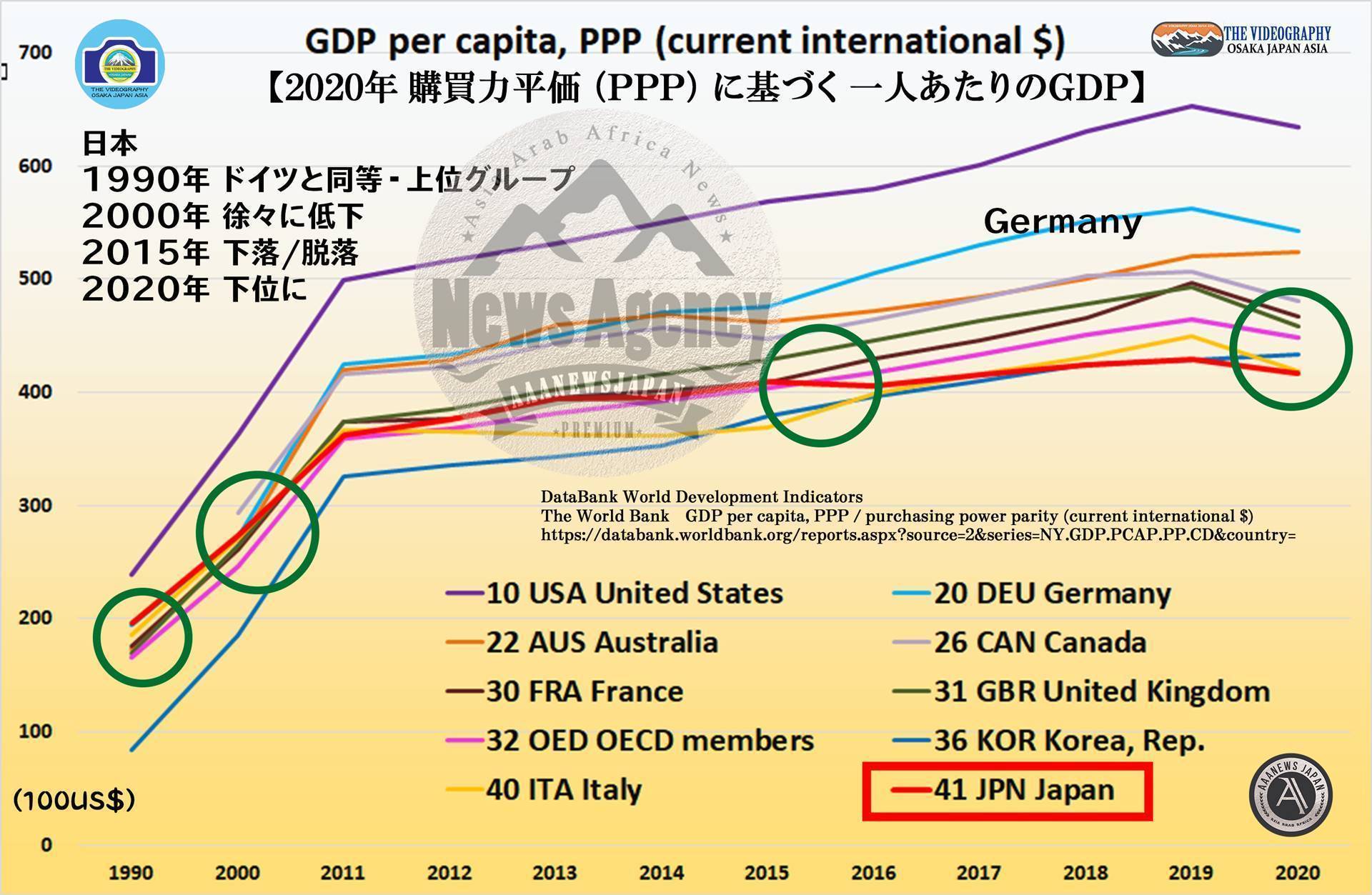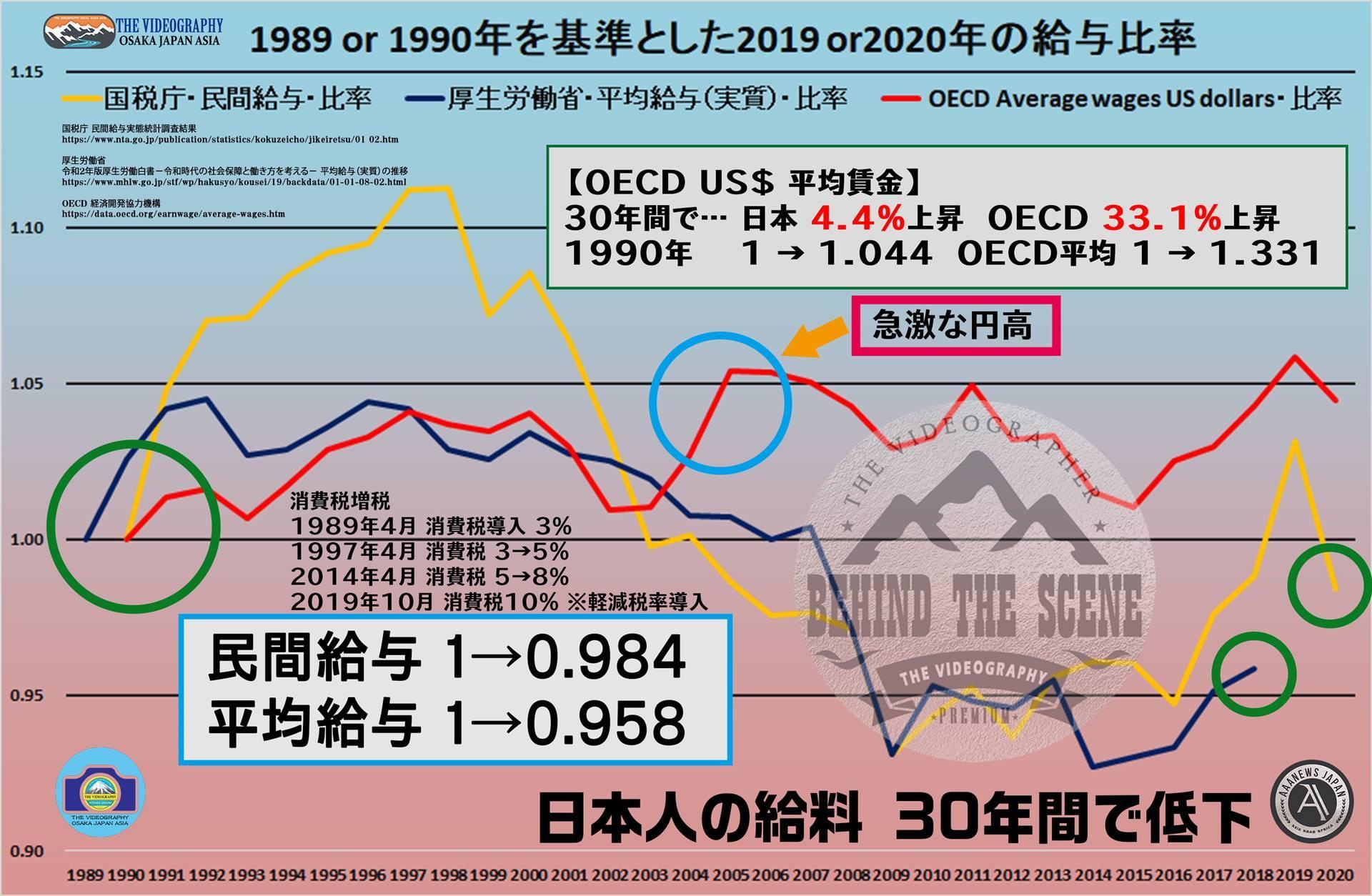 日本の給与のグラフ・日本が「のりのりまさのりダンス」を踊る日・Japan as Number Forty One : Lessons for Japan (ジャパン・アズ・ナンバーフォーティワン 日本への警告) 失われた30年 1990年~2020年までの日本経済没落の軌跡。成長しない 給料の上がらない 衰退している日本。