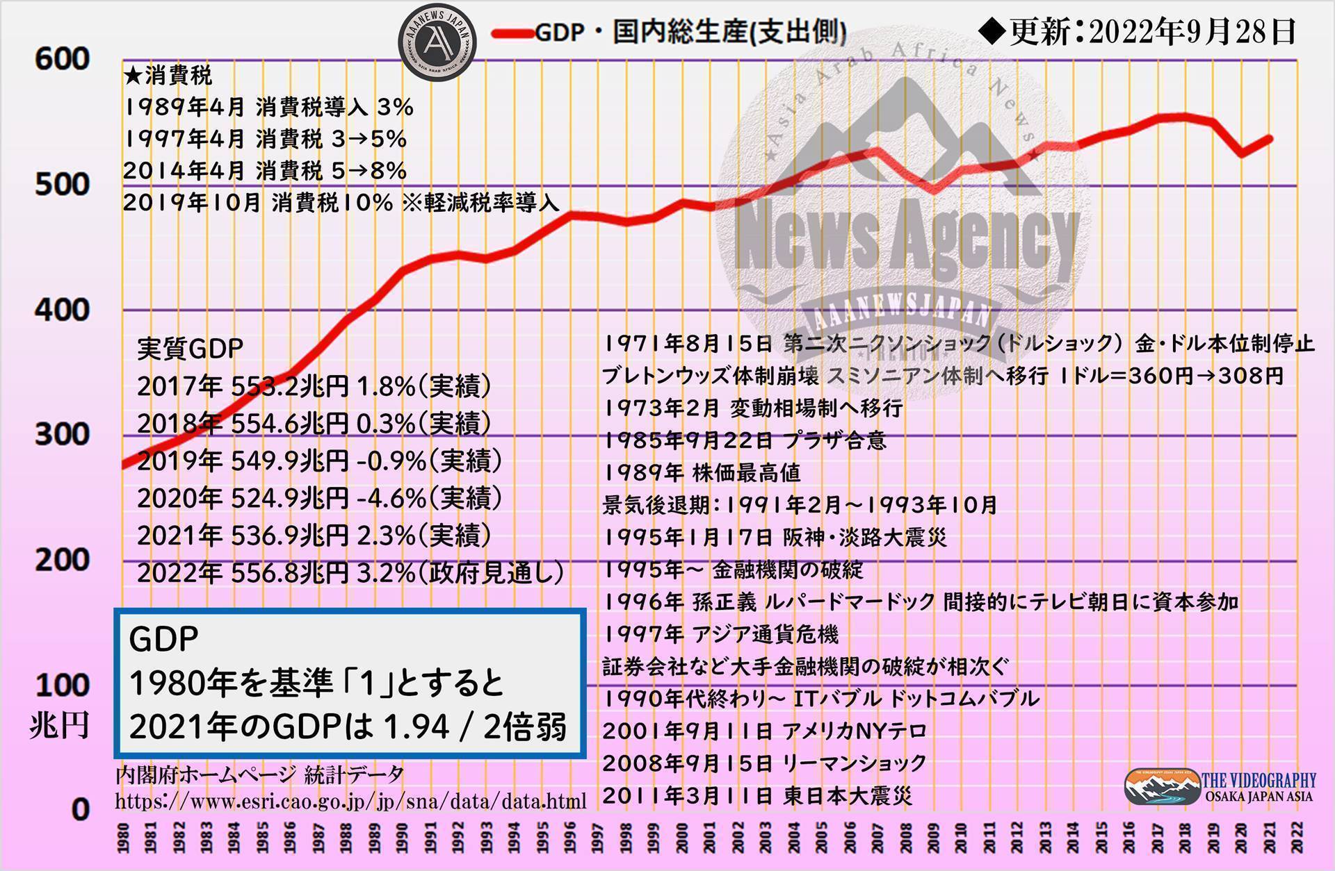 日本のGDP Gross Domestic Product 国内総生産 1980年~2022年の推移。1980年を基準 「1」とすると、2021年のGDPは 1.94 / 2倍弱。実質GDP 2019年 549.9兆円 -0.9%、2020年 524.9兆円 -4.6%、2021年 536.9兆円 2.3%、2022年 556.8兆円 3.2%(政府見通し)