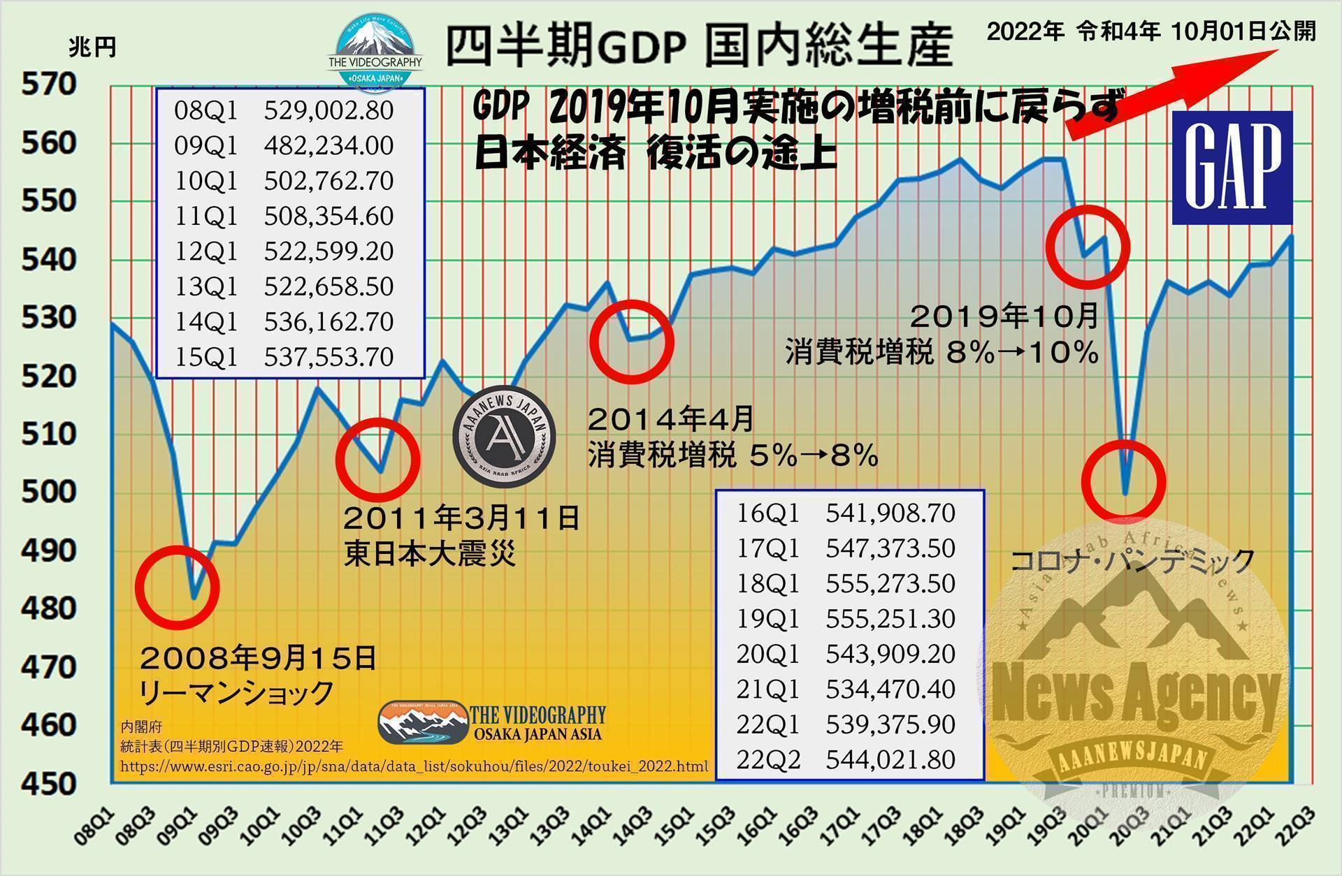 日本の四半期別 国内総生産 GDP 544兆円・2022年4-6月期の日本のGDP 国内総生産 544兆円・コロナパンデミック及び、2018年10月実施の増税前のGDP水準 555兆円に戻らず 日本経済 回復途上