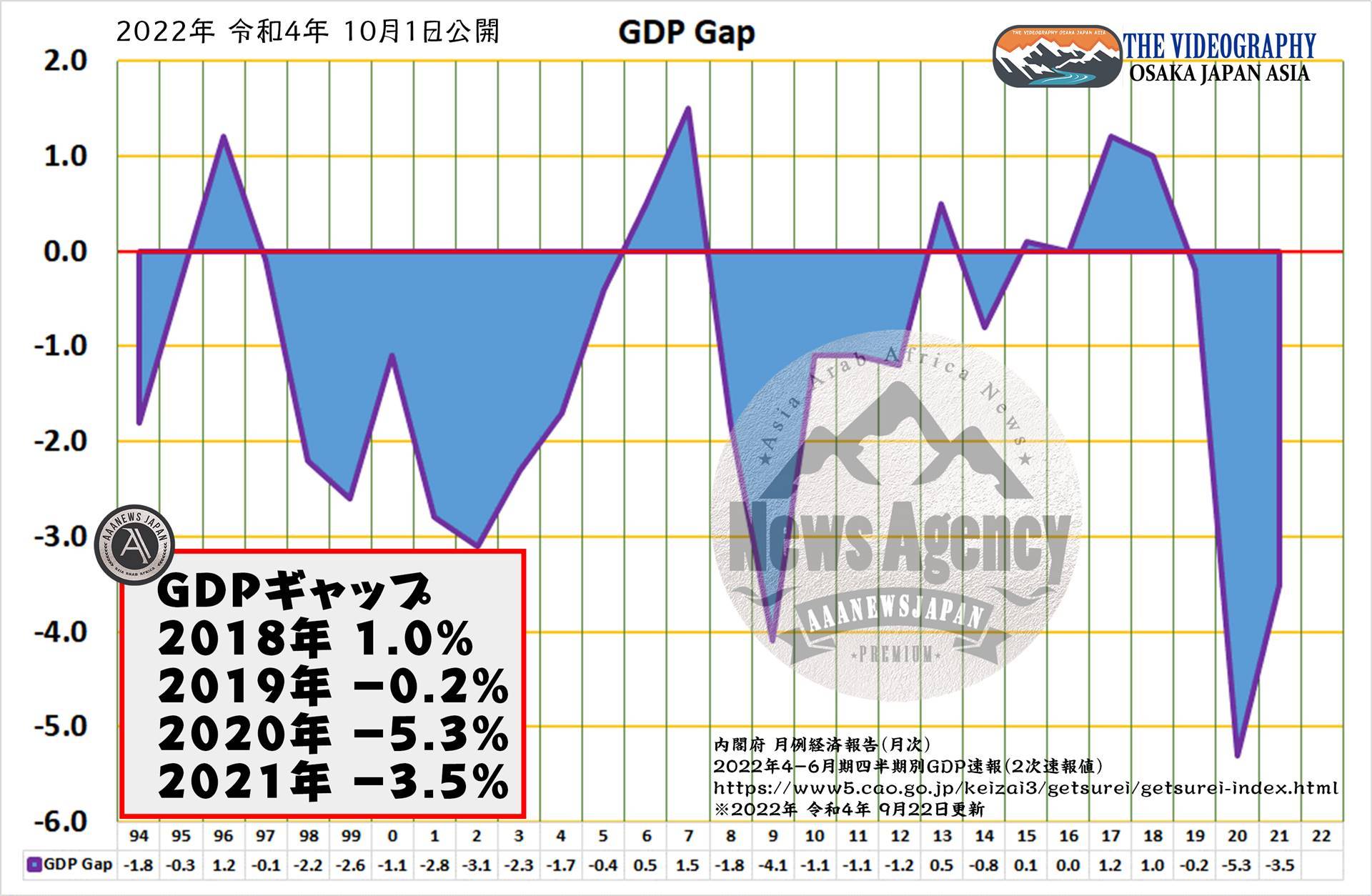 GDPギャップ 需給ギャップ・2022年第一四半期 -3.6% -20兆円・GDPギャップ 2020年 -5.3%、2021年 -3.6%