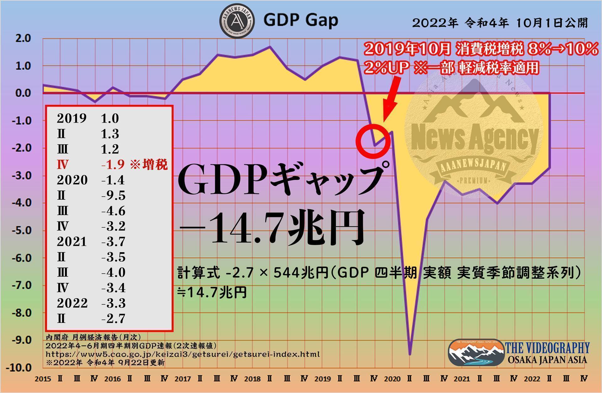 需給ギャップ GDPギャップ -2.7% -15兆円弱・2022年4-6月期四半期別 GDPギャップ -2.7%・需給ギャップ -15兆円弱。2021年 -3.5% 2020年 -5.3% 2019年 -0.2% 2018年 1.0%。