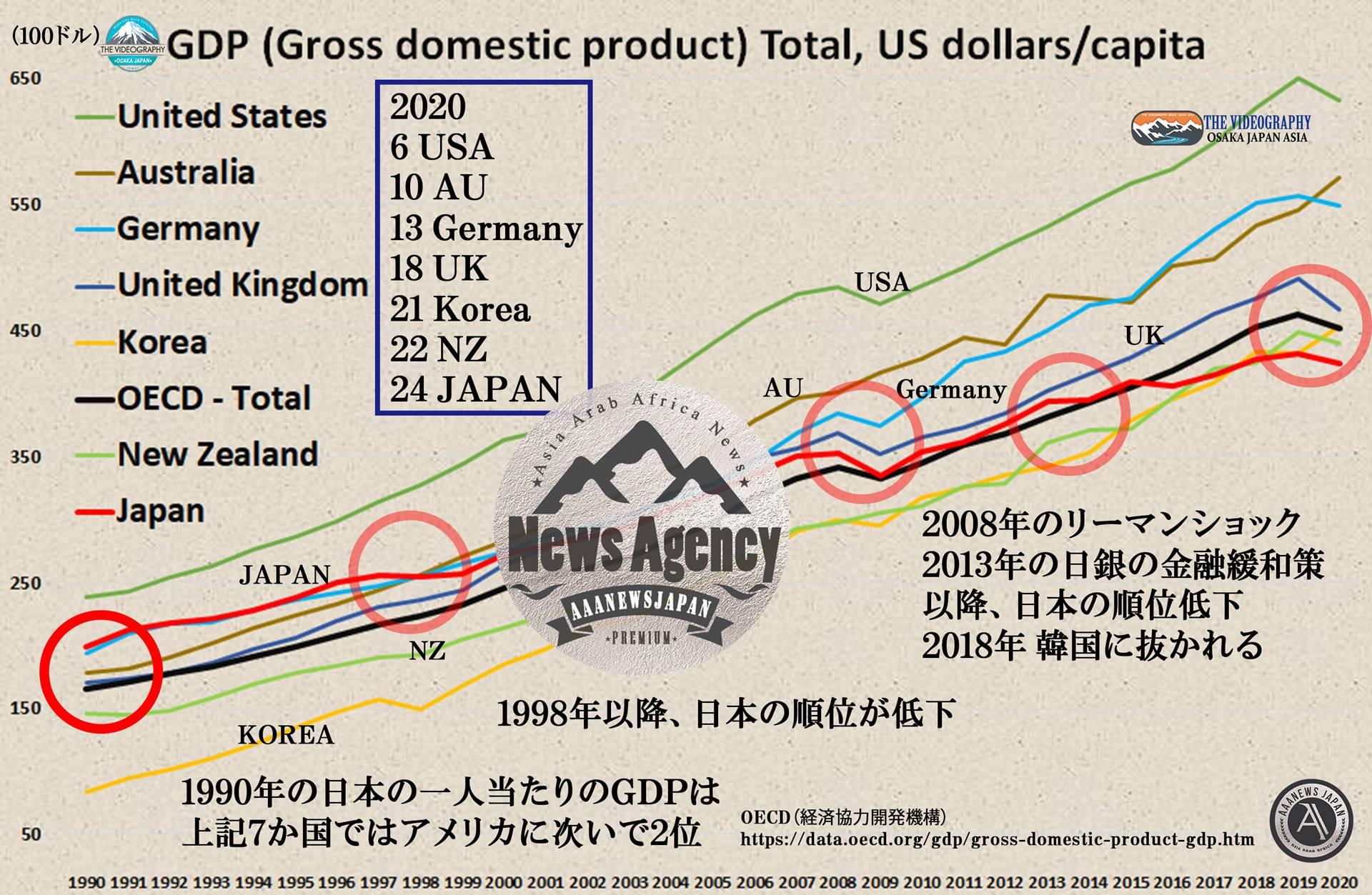 OECD 経済開発協力機構 Gross domestic product (GDP)Total, US dollars/capita・一人当たりのGDP 一人当たりの国内総生産 2020年の順位