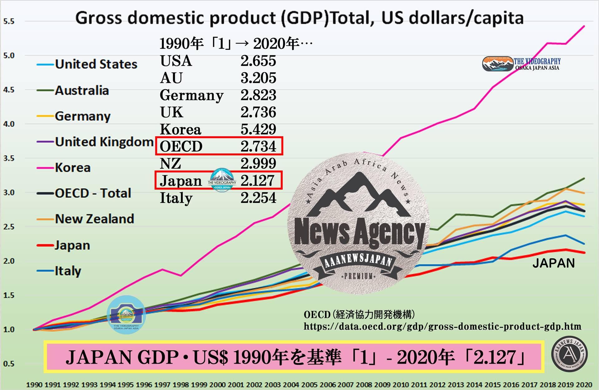 一人当たりGDP 1990を基準に 2020年の数値は… OECD 経済開発協力機構 Gross domestic product (GDP)Total, US dollars/capita 1990 – 2020
