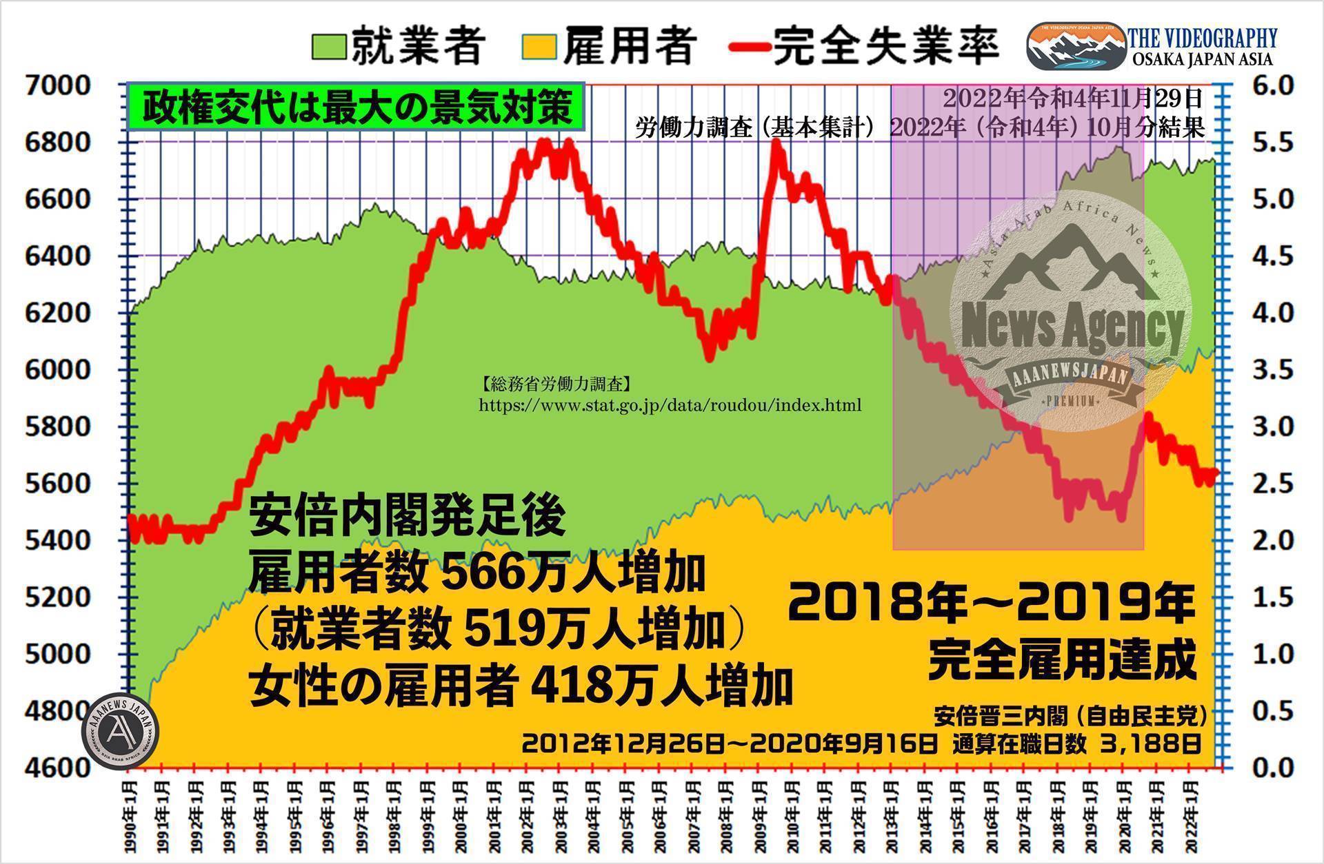 詳しくは… 「完全失業率 2.6%・完全失業者数 178万人・日本(2022年令和4年10月季節調整値)。先月の9月は失業率 2.6% 失業者数 183万人・失業者数 5万人減少。失業者数減少傾向・コロナパンデミックによる景気悪化から回復の兆し」のページにて確認願います。
